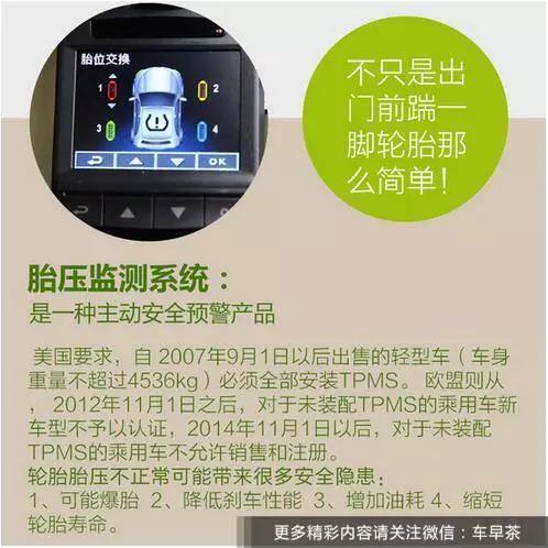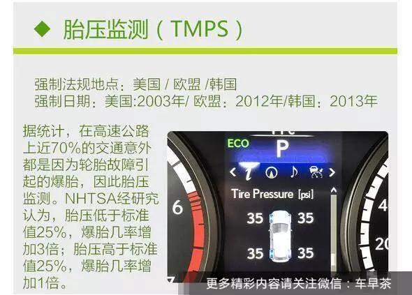 胎壓監(jiān)測(TPMS)胎壓監(jiān)測能夠在轎車行進過程中對輪胎氣壓進行實時主動監(jiān)測,在發(fā)作輪胎漏氣和低氣壓時進行報警,以確保行車安全,是一個十分有用的裝備,在中國,胎壓監(jiān)測通常都需求額定加裝,而美國和歐盟,分別在2007年和2012年就請求乘用車有必要悉數(shù)設備TPMS胎壓監(jiān)測設備。